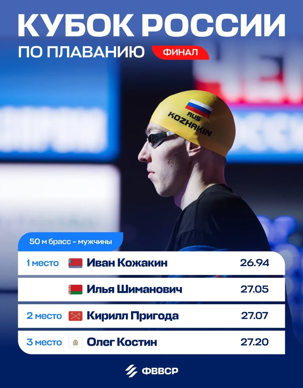 Мастер спорта международного класса Иван Кожакин стал победителем финала Кубка России по плаванию на дистанции 50 метров брассом. В Санкт Петербурге с 17 по 21 апреля проходит финал Кубка России по плаванию, который является отборочным на чемпионат Европы 2026 в Париже.