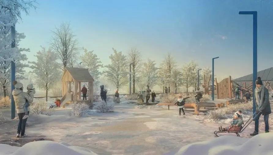 Детское пространство будет включать в себя две площадки: «Ясли оленевода» – для детей старше 3-х лет, тематически отсылающая к культуре оленеводства, и «Покоритель Севера» – для детей старше 6 лет, «рассказывающая» об идентичности города и истории золотодобычи.