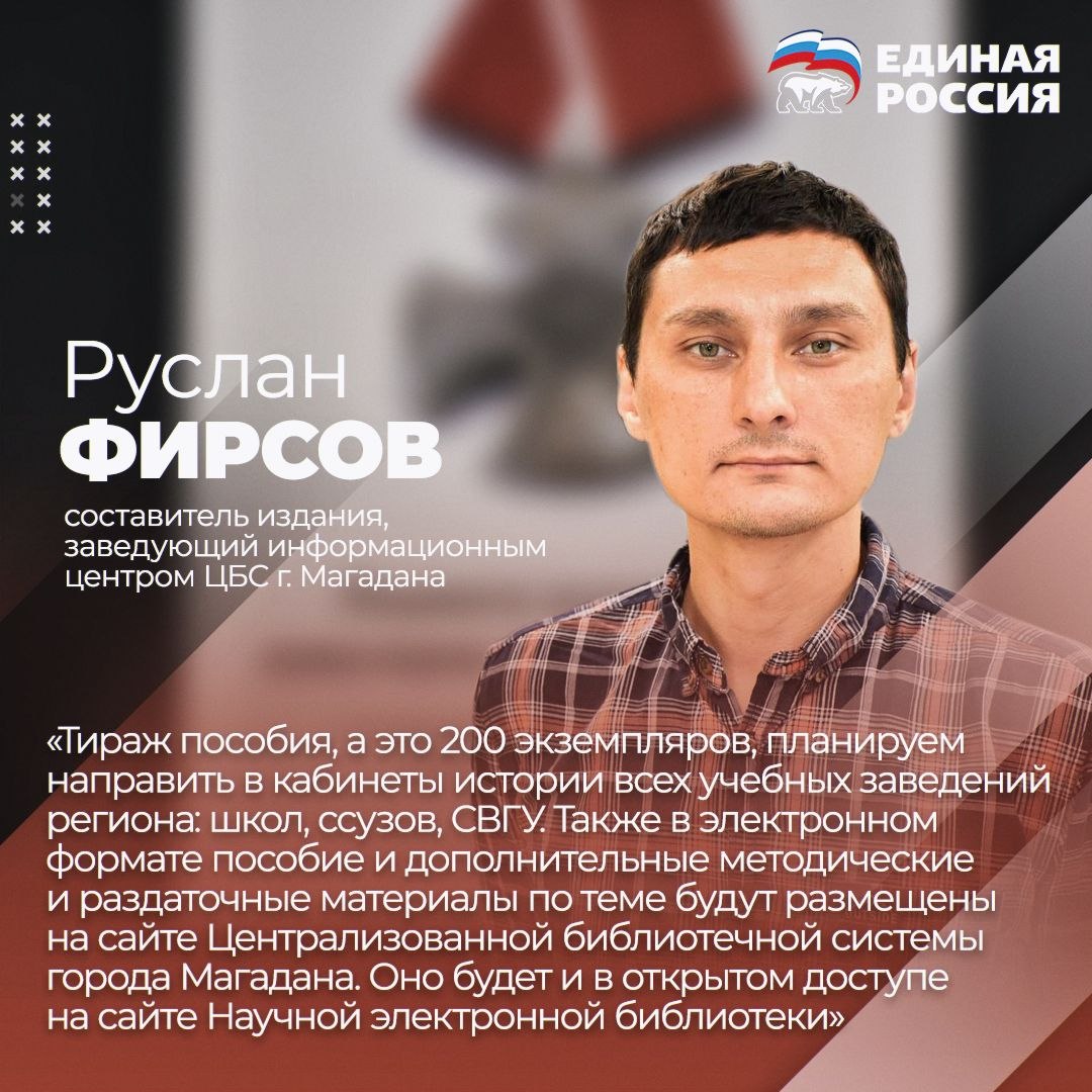 Составитель пособия – заведующий информационным центром ЦБС г. Магадана Руслан Фирсов. По его словам, в первую очередь оно адресовано учителям истории: в издании прописаны подробные шаги по внедрению краеведческих знаний на классных и внеклассных занятиях, в проектной и исследовательской деятельности.