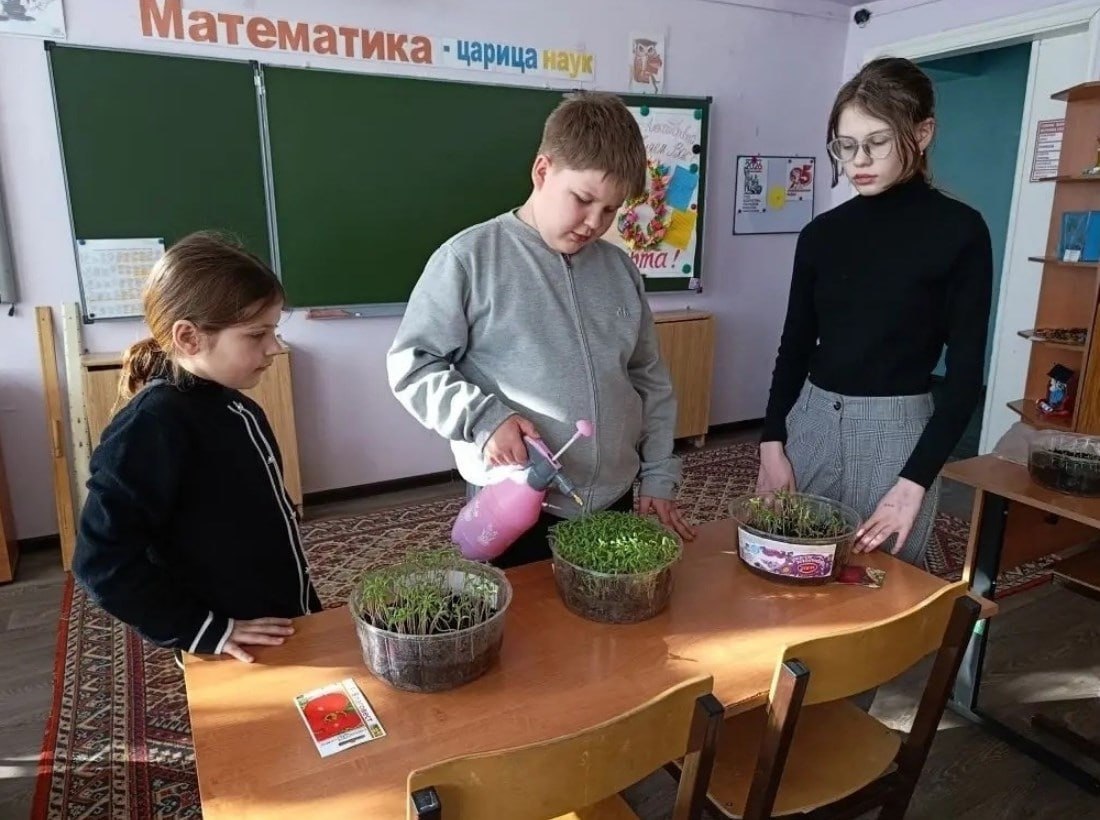 Для лучших всходов ученики начальных и средних классов сначала замачивают семена перцев, томатов, баклажанов в перекиси водорода. Затем ребята набирают в пластиковые коробки плодородной земли и сеют семена овощных культур. Коробки затягивают пленкой, соорудив тем самым мини-парники, и ставят на подоконник.