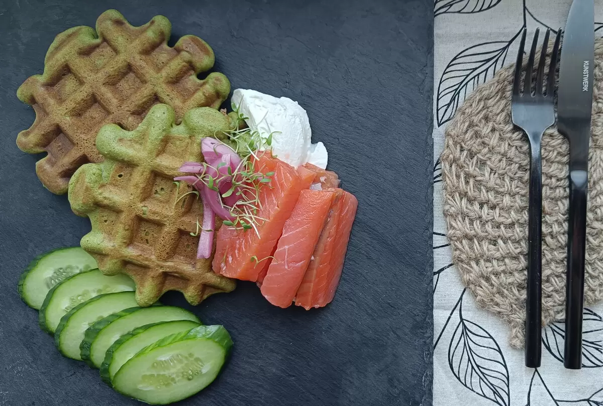 Эти зеленые вафли идеально сочетаются с различными начинками. Попробуйте подавать их с рикоттой, кусочками форели, огурцами и маринованным луком — это создаст неповторимый гастрономический опыт!