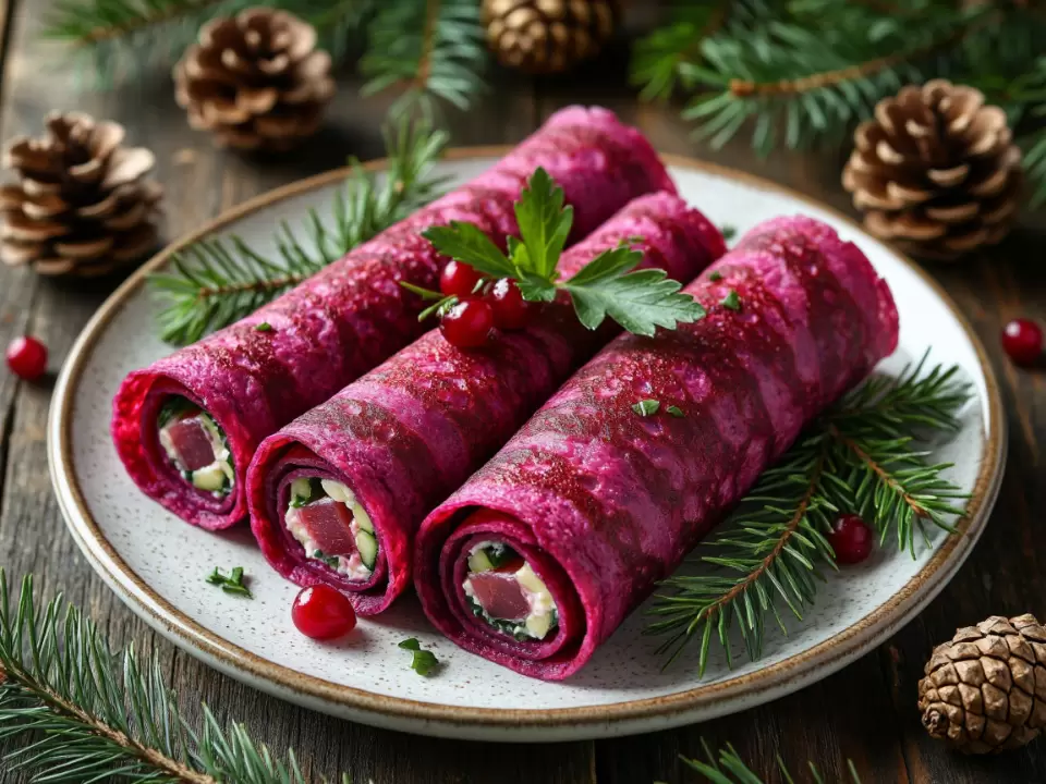 Ищете способ разнообразить привычный новогодний салат? Рулеты из свекольных блинов с начинкой, знакомой всем почитателям «селедки под шубой», подарят праздничному столу оригинальность и стиль. Эта закуска станет отличным решением для фуршета, позволяя удивить гостей привычным вкусом в новом формате, который легко подавать и наслаждаться.